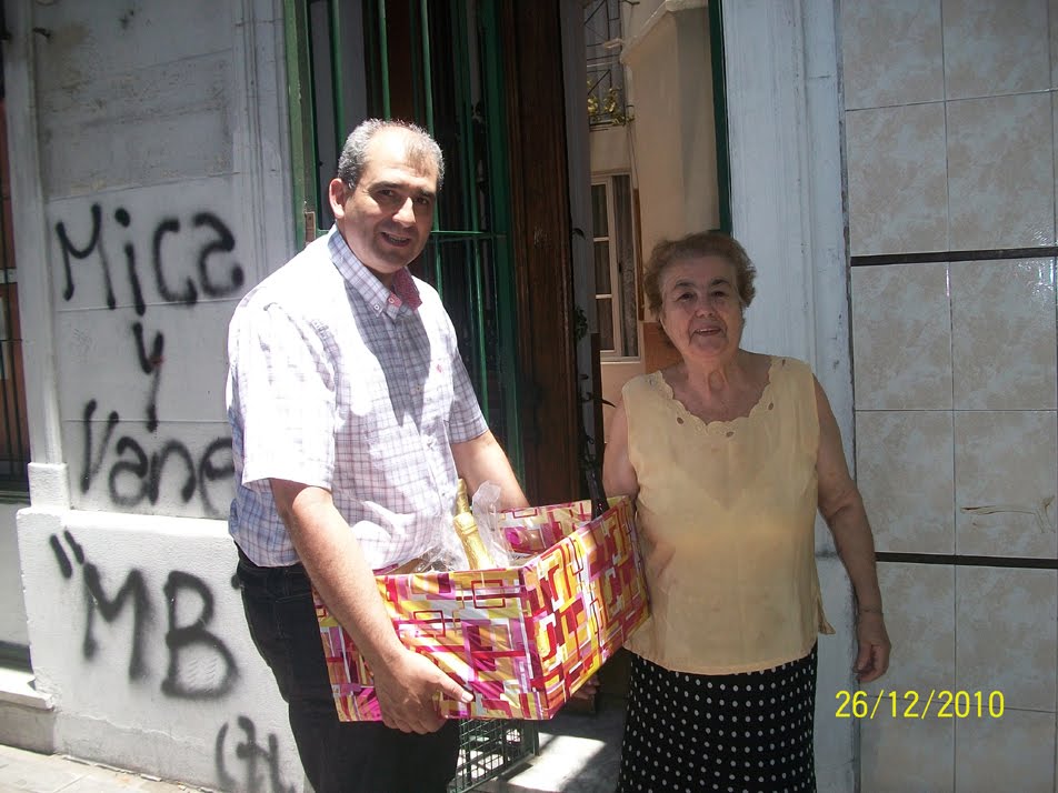 Entregando a la Sra Maria Luisa Viegas la canasta navideña que se ganó en el sorteo del domingo pasado.